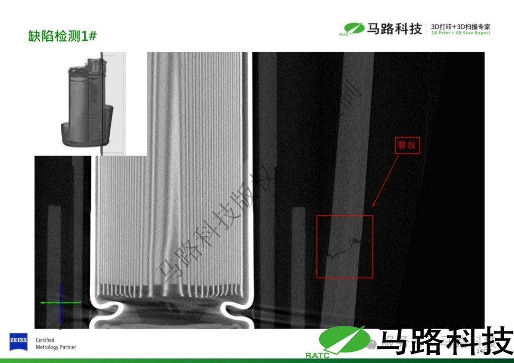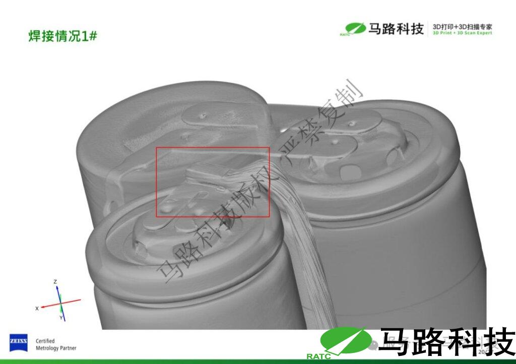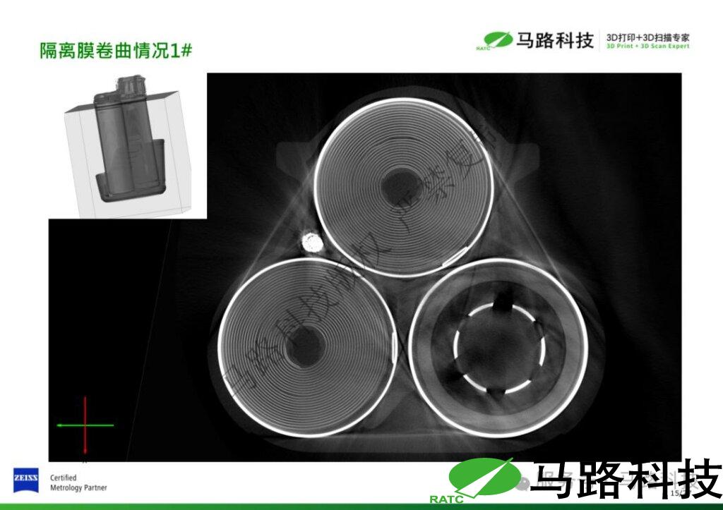 通过工业CT建立三维模型,马路科技工程师能够精准定位电池内部缺陷位置、测量缺陷大小,准确评估隔离膜卷曲程度,并完成焊接位等一系列质量检查,为电池生产和质量控制提供科学决策依据。