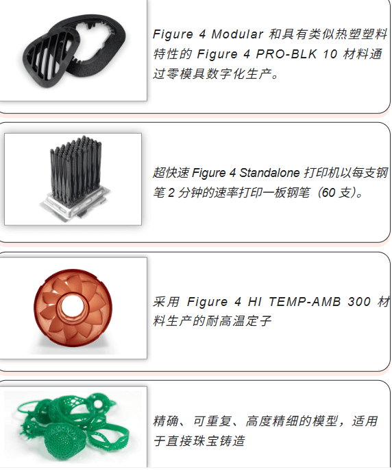 Figure 4 适用的材料种类广泛,而且还在不断扩展,可满足多种多样对功能性原型制造、最终用途部件直接生产、注塑成型和铸造的应用需求,此外还适用具有类似热塑塑料特性的刚性耐久材料、类橡胶、耐热和生物相容性材料。