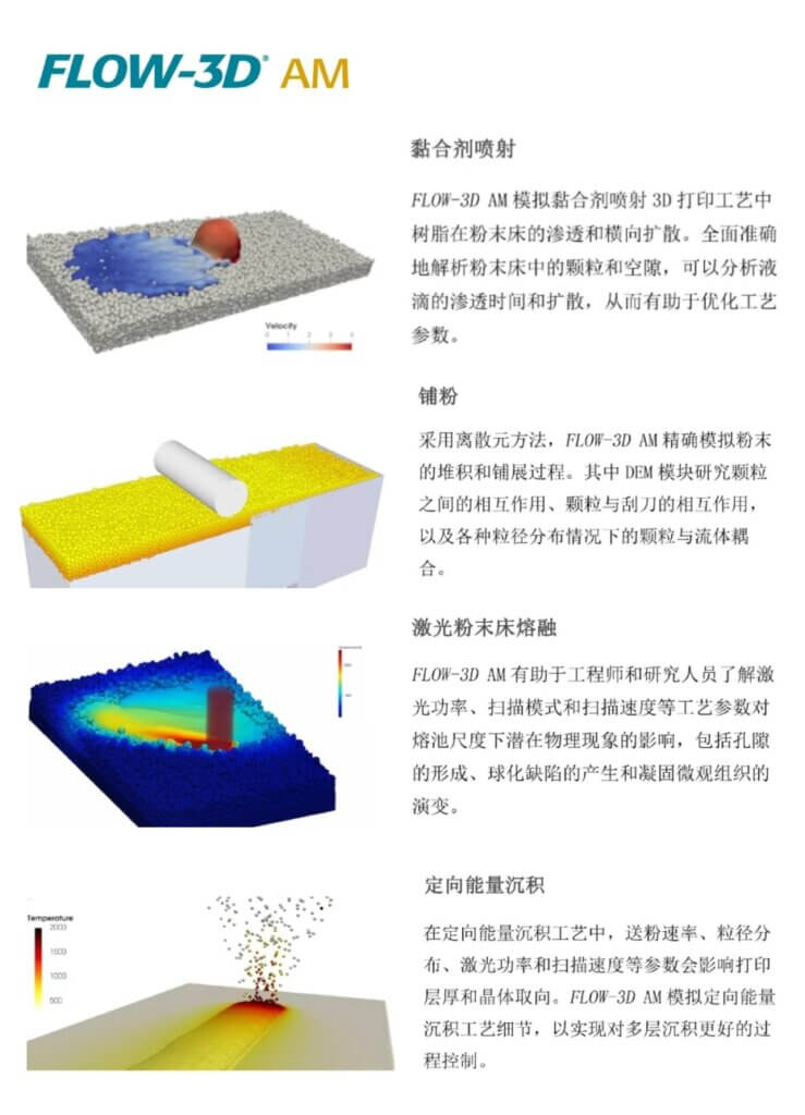 马路科技FLOW-3D AM软件基于离散元方法(DEM)和计算流体动力学(CFD)为各种增材制造过程提供建模平台,包括粉末床熔融、定向能量沉积、黏结剂喷射以及材料挤出等。FLOW-3D AM 的自由液面跟踪算法和多物理场建模功能可高精度模拟铺粉、熔池动力学、孔隙形成、渗透和扩散,分析和优化工艺参数。