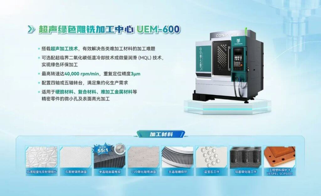此次入驻的超声绿色雕铣加工中心UEM-600,搭载超声加工技术,有效解决各类难加工材料的加工难题;可选配超临界二氧化碳低温冷却技术或微量润滑(MQL)技术,实现绿色环保加工;最高转速达40,000 rpm/min,重复定位精度3μm;配置四轴或五轴转台,满足集约化生产需求。适用于硬脆材料、复合材料、难加工金属材料等精密零件的微小孔及表面高光加工。