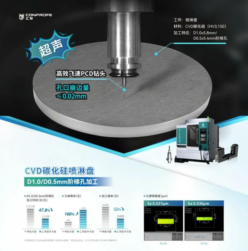 该设备加工典型超硬脆材料——CVD碳化硅喷淋盘,更实现了关键性技术突破。CVD 碳化硅喷淋盘材料硬度高达HV3,150,因工件易崩缺、刀具易损耗、加工周期长、加工成本高等问题长期依赖国外进口。使用汇专超声绿色雕铣加工中心UEM-600,搭配超声加工技术、超声振幅测量仪、超声绿色冷压刀柄、高效飞速PCD钻头的组合加工方案,成功将D1.0/D0.5mm 阶梯孔的单孔加工时间从11分25秒缩短至5分58秒,加工效率提升47.8%;刀具寿命达520个孔,提升160%;加工成本大幅降低50%。