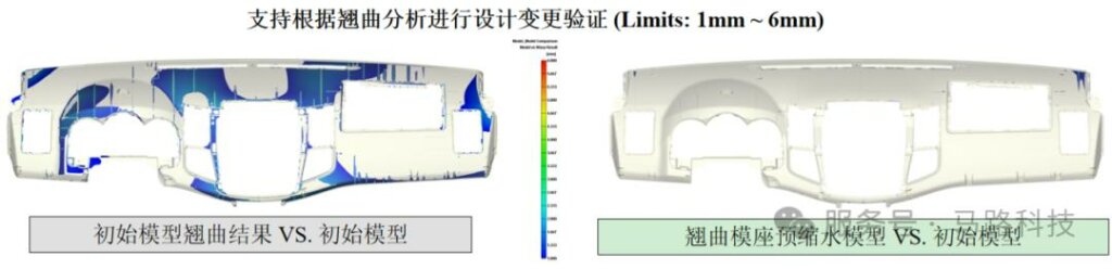 原始模型、翘曲结果及汇入模型间的比较,支持根据翘曲分析进行设计变更验证。