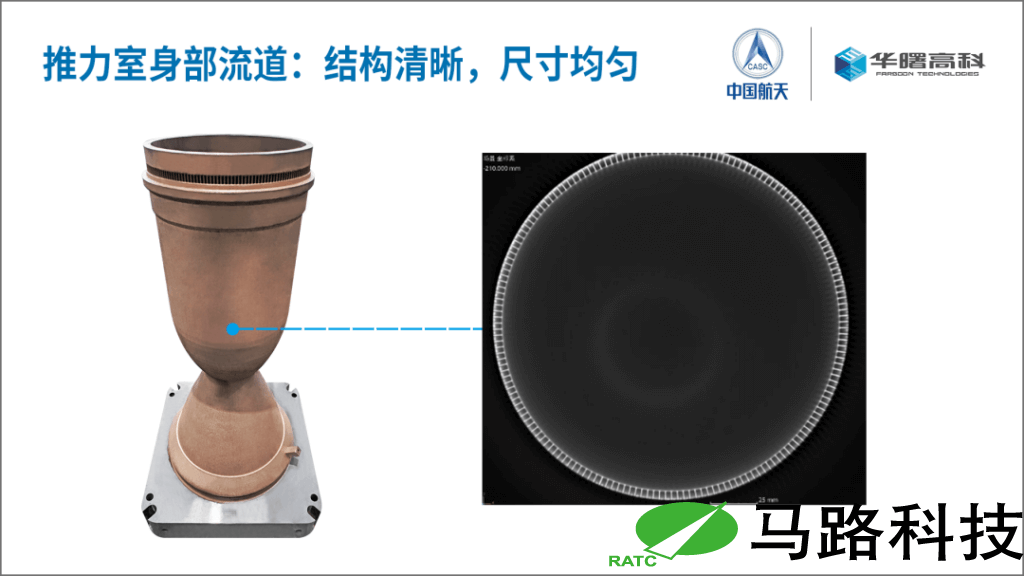 为确保火箭发动机推力室身部槽道结构尺寸精度,提高一次打印成功率,首都航天机械有限公司截取零件典型局部进行打印验证,并对槽道进行抛光处理,减少压降,提高发动机性能,经验证后最终成功打印出推力室整体零件。对推力室身部流道结构进行X光扫描,可以看出其流道特征结构清晰、尺寸均匀,粉末清理彻底,成品品质优异。