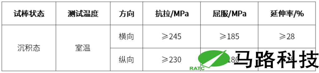 与此同时,对打印出的拉伸试棒进行了沉积态下的力学性能测试,结果显示其力学性能综合表现优异。另外,对打印的测试样块还进行了导热性测试,测试结果表明,在常温下,该样块的导热系数不低于345[W/(m·K)],热扩散系数不小于95(mm²/s),比热容则大于或等于0.35[J/(g·K)]。