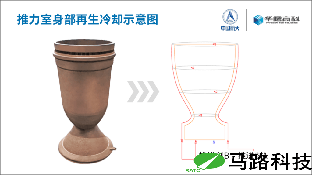 推力室是液体火箭发动机的核心,在极端温度、压力、振动和氧化环境下运行,是液体火箭发动机中最复杂、制造难度最大、制造周期最长的部件。推力室通常采用夹层流道设计,利用再生冷却方法,在发动机工作循环中使用推进剂来整体冷却推力室侧壁,同时又可保持足够的壁温来加热推进剂,从而提高喷注效果。
