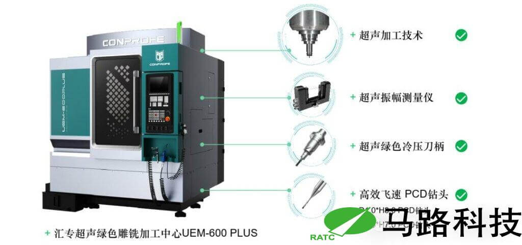 马路科技汇专超声高效加工解决方案,由汇专自主研发的数控机床,搭载超声加工技术和高性能刀具组合而成,在硬脆材料、金属材料、工程塑料的超深微孔及高精度加工上取得了创新突破。